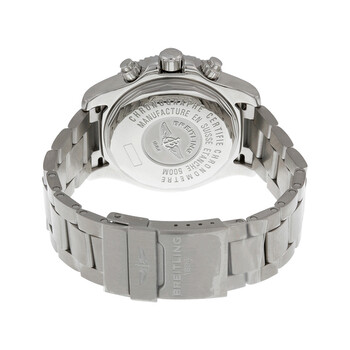 Stainless steel case with a stainless steel bracelet. Unidirectional ratcheted stainless steel bezel with black ion-plated top ring. Black dial with luminous hands and index hour markers. Minute markers. 1/100th markers around the outer rim. Dial Type: Analog. Luminescent hands and markers. Date display at the 3 o'clock position. Chronograph - three sub-dials displaying: 60 seconds, 30 minutes and 12 hours. Self winding mechanical movement. Scratch resistant glareproofed sapphire crystal. Screw locked crown. Solid case back. Case diameter: 44 mm. Case thickness: 17 mm. Water resistant at 500 meters / 1650 feet. Functions: hours, minutes, seconds, chronograph, date. Casual watch style. Breitling Superocean Chronograph II Men's Watch A1334102-BA85SS.