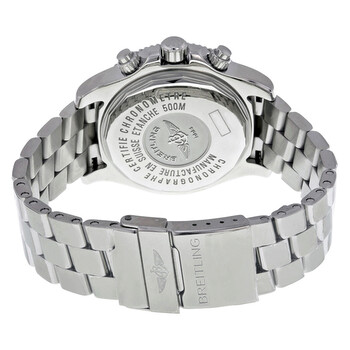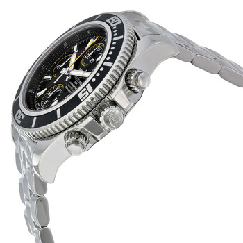 Stainless steel case with a stainless steel bracelet. Unidirectional stainless steel bezel with a black ion-plated top ring. Abyss black and yellow dial with luminous hands and index hour markers. Minute markers around the outer rim. Dial Type: Analog. Luminescent hands and markers. Date display at the 3 o'clock position. Chronograph - three sub-dials displaying: 60 second, 30 minute and 12 hour. Automatic movement with a 42-hour power reserve. Scratch resistant sapphire crystal. Screw locked crown. Solid case back. Case diameter: 44 mm. Case thickness: 17.20 mm. Round case shape. Band width: 20 mm / 22 mm. Deployment clasp. Water resistant at 500 meters / 1650 feet. Functions: chronograph, date, hour, minute, second. Dress watch style. Watch label: Swiss Made. Breitling Superocean Chronograph II Men's Watch A13341A8-BA82SS