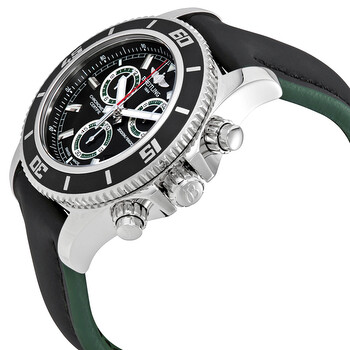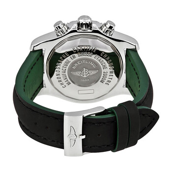 Stainless steel case with a black leather (rubber backed) strap. Uni-directional rotating stainless steel bezel with a black top ring. Black dial with luminous silver-tone hands and index hour markers. Minute markers. 1/100 second markers around the outer rim. Dial Type: Analog. Luminescent hands and markers. Date display between the 4 and 5 o'clock positions. Chronograph - three sub-dials displaying: 60 second, 30 minute and 12 hour. Breitling calibre 73 quartz movement with a 40-hour power reserve. Scratch resistant sapphire crystal. Screw locked crown. Solid case back. Round case shape. Case size: 46 mm. Case thickness: 13.60 mm. Band width: 24 mm / 20 mm. Tang clasp. Water resistant at 2000 meters / 6600 feet. Functions: chronograph, date, hour, minute, second, chronometer. Dive watch style. Watch label: Swiss Made. Breitling Superocean Chronograph M2000 Chronometer Black Dial Men's Watch A73310A8/BB75-234x.