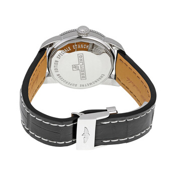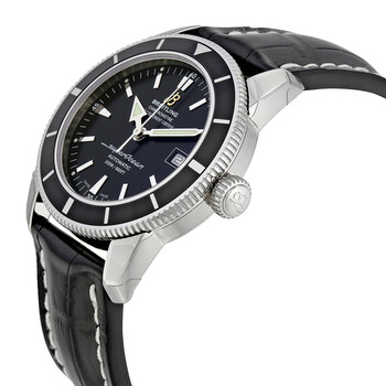 Stainless steel case with a black crocodile leather strap. Uni-directional rotating stainless steel bezel with a black top ring. Black dial with luminous hands and index hour markers. Minute markers around the outer rim. Dial Type: Analog. Luminescent hands and markers. Date display at the 3 o'clock position. Automatic movement with a 40 hour power reserve. Scratch resistant sapphire crystal. Screw locked crown. Solid case back. Case diameter: 42 mm. Case thickness: 13.60 mm. Round case shape. Band width: 22 mm / 20 mm. Deployment clasp. Water resistant at 200 meters / 660 feet. Functions: date, hour, minute, second. Luxury watch style. Watch label: Swiss Made. Item Variations: A1732124/BA61 744P-A20D.1. Breitling Superocean Heritage 42 Automatic Black Dial Black Leather Men's Watch A1732124-BA61BKCD.