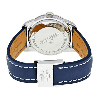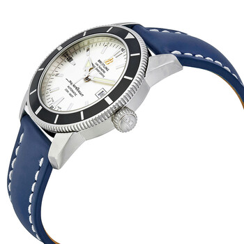 Stainless steel case with a blue leather strap. Uni-directional rotating stainless steel bezel with a black top ring. Silver dial with luminous silver-tone hands and index hour markers. Minute markers around the outer rim. Dial Type: Analog. Luminescent hands and markers. Date display at the 3 o'clock position. Breitling 17 automatic movement with a 40-hour power reserve. Scratch resistant sapphire crystal. Screw locked crown. Solid case back. Case size: 42 mm. Case thickness: 12.95 mm. Round case shape. Band width: 22 mm / 20 mm. Deployment clasp. Water resistant at 200 meters / 660 feet. Functions: date, hour, minute, second. Luxury watch style. Watch label: Swiss Made. Breitling Superocean Heritage 42 Automatic Men's Watch A1732124-G717-112X-A20D.