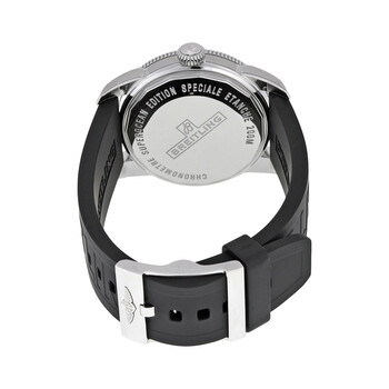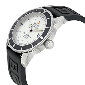 Stainless steel case with a black (diver pro III) rubber strap. Uni-directional rotating stainless steel bezel with a black top ring. Silver dial with luminous silver-tone hands and index hour markers. Minute markers around the outer rim. Dial Type: Analog. Luminescent hands and markers. Date display at the 3 o'clock position. Automatic movement with a 40-hour power reserve. Scratch resistant sapphire crystal. Screw locked crown. Solid case back. Case diameter: 42 mm. Case thickness: 13.60 mm. Round case shape. Band width: 22 mm / 20 mm. Tang clasp. Water resistant at 200 meters / 660 feet. Functions: date, hour, minute, second. Luxury watch style. Watch label: Swiss Made. Item Variations: A1732124/G717 152S-A20S.1. Breitling Superocean Heritage 42 Automatic Silver Dial Black Rubber Men's Watch A1732124-G717BKPT3.