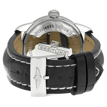 Stainless steel case with a black crocodile leather strap. Uni-directional rotating stainless steel bezel with an 18kt rose gold top ring. Black dial with luminous rose gold hands and index hour markers. Minute markers around the outer rim. Dial Type: Analog. Luminescent hands and markers. Date display at the 3 o'clock position. Automatic movement with a 42 hour power reserve. Scratch resistant sapphire crystal. Screw locked crown - two gaskets. Solid case back. Case diameter: 42 mm. Case thickness: 12.95 mm. Round case shape. Band width: 22 mm. Tang clasp. Water resistant at 200 meters / 660 feet. Functions: date, hour, minute, second. Luxury watch style. Watch label: Swiss Made. Breitling Superocean Heritage 42 Automatic Men's Watch U1732112-BA61BKCT.