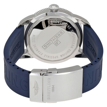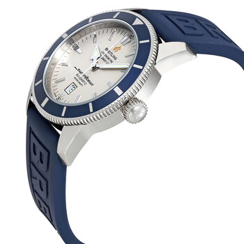 Stainless steel case with a blue rubber (Pro Diver 3) strap. Fixed stainless steel bezel with a blue top ring. Silver dial with luminous silver-tone hands and index hour markers. Minute markers around the outer rim. Dial Type: Analog. Luminescent hands and markers. Date display above the 6 o'clock position. Breitling Calibre 17 automatic movement. Scratch resistant sapphire crystal. Screw locked crown. Solid case back. Round case shape. Case size: 46 mm. Case thickness: 13.6 mm. Band width: 22 mm / 24 mm. Deployment clasp. Water resistant at 200 meters / 660 feet. Functions: date, hour, minute, second. Luxury watch style. Watch label: Swiss Made. Breitling Superocean Heritage 46 Automatic Silver Dial Men's Watch A1732016-G642BLPD3.