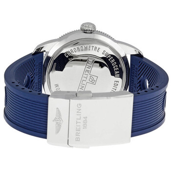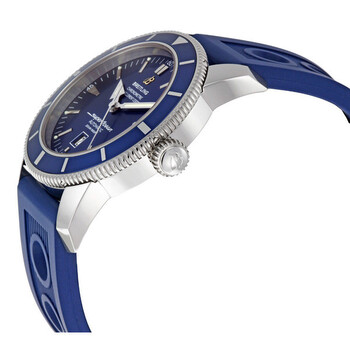 Silver-tone stainless steel case with a blue ocean racer rubber strap. Uni-directional rotating coin edge stainless steel bezel with a blue count-up elapsed time top ring. Blue dial with luminous hands and index hour markers. Minute markers around the outer rim. Dial Type: Analog. Luminescent hands and markers. Date display at the 6 o'clock position. Breitling Calibre 17 Automatic movement, based upon ETA 2824-2, containing 25 Jewels, bitting at 28800 vph, and has a power reserve of approximately 42 hours. Scratch resistant sapphire crystal. Screw locked crown. Solid case back. Round case shape, case size: 46 mm, case thickness: 13.6 mm. Band width: 24 mm. Deployment clasp. Water resistant at 200 meters / 660 feet. Functions: chronometer, date, hour, minute, second. Superocean Heritage 46 Series. Dress watch style. Watch label: Swiss made. Breitling Superocean Heritage 46 Men's Watch A1732016-C734BLOR.