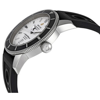 Stainless steel case with a black (ocean racer) rubber strap. Uni-directional rotating stainless steel bezel with black ion-plated top ring. Silver dial with luminous silver-tone hands and index hour markers. Minute markers around the outer rim. Dial Type: Analog. Luminescent hands and markers. Date display at the 6 o'clock position. Breitling calibre 17 automatic movement with a 40-hour power reserve. Scratch resistant sapphire crystal. Screw locked - two gaskets crown. Solid case back. Round case shape. Case size: 46 mm. Case thickness: 13.60 mm. Band width: 24 mm. Deployment clasp. Water resistant at 200 meters / 660 feet. Functions: chronometer, date, hour, minute, second. Sport watch style. Watch label: Swiss Made. Breitling SuperOcean Heritage 46 Men's Watch A1732024-G642BKOR.