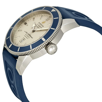 Stainless steel case with a blue ocean racer strap. Uni-directional rotating stainless steel bezel with a blue top ring. Silver dial with luminous silver-tone hands and index hour markers. Minute markers around the outer rim. Dial Type: Analog. Luminescent hands and markers. Date display at the 6 o'clock position. Automatic movement with a 40 hour power reserve. Scratch resistant sapphire crystal. Screw locked crown. Solid case back. Case diameter: 46 mm. Case thickness: 13.6 mm. Round case shape. Tang clasp. Water resistant at 200 meters / 660 feet. Dress watch style. Watch label: Swiss Made. Breitling Superocean Heritage 46 Silver Dial Blue Rubber Men's Watch A1732016-G642BLOR.