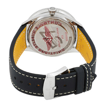 Silver-tone stainless steel case with a black calfskin leather strap. Bi-directional rotating stainless steel bezel with a black ceramic ring. Black dial with silver-tone hands and index hour markers. Minute markers around the outer rim. Dial Type: Analog. Luminescent hands and markers. Breitling Calibre 10 Automatic movement, based upon ETA 2892-A2, containing 21 Jewels, bitting at 28800 vph, and has a power reserve of approximately 42 hours. Scratch resistant sapphire crystal. Solid case back. Round case shape, case size: 42 mm, case thickness: 9.9 mm. Band width: 20/18 mm. Tang clasp. Water resistant at 100 meters / 330 feet. Functions: hour, minute, second. Superocean Heritage 57 Series. Luxury watch style. Watch label: Swiss Made. Breitling Superocean Heritage 57 Automatic Black Dial Men's Watch A10370121B1X1.