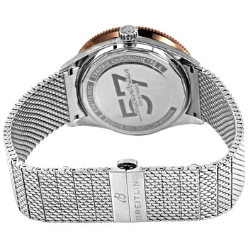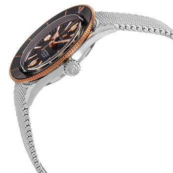 Stainless steel case with a stainless steel mesh bracelet. Uni-directional rotating 18kt rose gold bezel with a black ceramic ring. Black dial with luminous rose gold-tone hands and index hour markers. Minute markers around the outer rim. Dial Type: Analog. Luminescent hands and markers. Breitling caliber 10 automatic movement with a 42-hour power reserve. Scratch resistant sapphire crystal. Pull / push crown. Solid case back. Round case shape. Case size: 42 mm. Case thickness: 14.35 mm. Band width: 20 mm. Fold over clasp with a push button release. Water resistant at 100 meters / 330 feet. Functions: hour, minute, second. Superocean Heritage 57 Series. Luxury watch style. Watch label: Swiss Made. Breitling Superocean Heritage 57 Automatic Black Dial Watch U10370121B1A1.