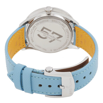 Stainless steel case with a aquamarine (calfskin) leather strap. Bi-directional rotating stainless steel bezel with an inlaid aquamarine ceramic ring. Blue dial with luminous silver-tone hands and index hour markers. Minute markers around the outer rim. Dial Type: Analog. Luminescent hands and markers. Breitling calibre 10 automatic movement, based upon ETA 2892-A2, containing 21 Jewels, bitting at 28800 vph, and has a power reserve of approximately 42 hours. Scratch resistant cambered sapphire, glareproofed both sides crystal. Pull / push crown. Solid case back. Round case shape. Case size: 38 mm. Case thickness: 9.2 mm. Band width: 18 mm / 16 mm. Fold over clasp. Water resistant at 100 meters / 330 feet. Functions: date, hour, minute, second. Superocean Heritage Series. Casual watch style. Watch label: Swiss Made. Breitling Superocean Heritage 57 Pastel Paradise Automatic Ladies Watch A10340161C1X1.