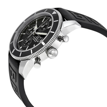 Stainless steel case with a black rubber (Diver Pro III) strap. Uni-directional rotating stainless steel bezel with a black top ring. Black dial with luminous silver-tone hands and index hour markers. Minute markers around the outer rim. Dial Type: Analog. Luminescent hands and markers. Date display at the 3 o'clock position. Chronograph - three sub-dials displaying: 60 second, 30 minute and 12 hour. Automatic movement with a 42 hour power reserve. Scratch resistant sapphire crystal. Screw locked crown. Solid case back. Case diameter: 46 mm. Case thickness: 16.4 mm. Round case shape. Band width: 24 mm / 20 mm. Deployment clasp. Water resistant at 200 meters / 660 feet. Functions: chronograph, date, hour, minute, second. Luxury watch style. Watch label: Swiss Made. Breitling Superocean Heritage Chronograph Black Dial Black Rubber Men's Watch A1332024-B908BKPD3.