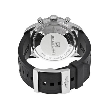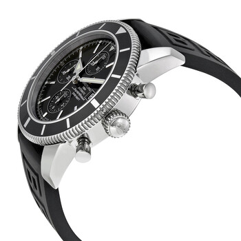 Stainless steel case with a black (diver pro III) rubber strap. Uni-directional rotating stainless steel bezel with a black top ring. Black dial with luminous silver-tone hands and index hour markers. Minute markers around the outer rim. Dial Type: Analog. Luminescent hands and markers. Date display at the 3 o'clock position. Chronograph - three sub-dials displaying: 60 second, 30 minute and 12 hour. Automatic movement with a 42 hour power reserve. Scratch resistant sapphire crystal. Screw locked crown. Solid case back. Case diameter: 46 mm. Case thickness: 16.4 mm. Round case shape. Band width: 24 mm / 20 mm. Tang clasp. Water resistant at 200 meters / 660 feet. Functions: chronograph, date, hour, minute, second. Luxury watch style. Watch label: Swiss Made. Item Variations: A1332024/B908 154S-A20S.1. Breitling Superocean Heritage Chronographe Black Dial Automatic Men's Watch A1332024-B908BKPT3.