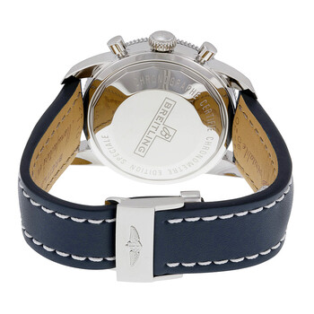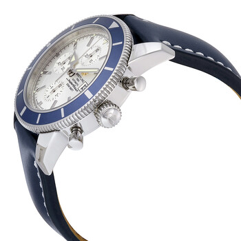 Stainless steel case with a blue leather strap. Uni-directional rotating stainless steel bezel with a blue top ring. Silver dial with luminous hands and index hour markers. Minute markers around the outer rim. Dial Type: Analog. Luminescent hands and markers. Date display at the 3 o'clock position. Chronograph - three sub-dials displaying: 60 second, 30 minute and 12 hour. Automatic movement with a 42 hour power reserve. Scratch resistant sapphire crystal. Screw locked crown. Solid case back. Case diameter: 46 mm. Case thickness: 16.70 mm. Round case shape. Band width: 24 mm / 20 mm. Deployment clasp. Water resistant at 200 meters / 660 feet. Functions: chronograph, date, hour, minute, second. Luxury watch style. Watch label: Swiss Made. Item Variations: A1332016/G698 102X-A20D.1. Breitling Superocean Heritage Automatic Chronograph Silver Dial Blue Leather Men's Watch A1332016-G698BLLD.