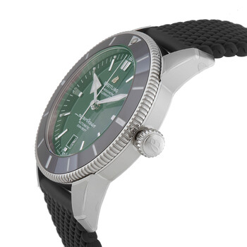 Silver-tone stainless steel case with a black rubber strap. Uni-directional rotating silver-tone stainless steel bezel with a black ceramic ring. Green dial with silver-tone hands and index hour markers. Minute markers around the outer rim. Dial Type: Analog. Luminescent hands and markers. Date display at the 6 o'clock position. Breitling Calibre B20 Automatic movement, based upon Tudor MT5612, containing 28 Jewels, bitting at 28800 vph, and has a power reserve of approximately 70 hours. Scratch resistant sapphire crystal. Screw down crown. Solid case back. Round case shape, case size: 46 mm, case thickness: 14.9 mm. Band width: 24/20 mm. Pushbutton folding clasp. Water resistant at 200 meters / 660 feet. Functions: date, hour, minute, second, chronometer. Superocean Heritage Series. Luxury watch style. Watch label: Swiss Made. Breitling Superocean Heritage Automatic Chronometer Green Dial Men's Watch AB2020121L1S1.