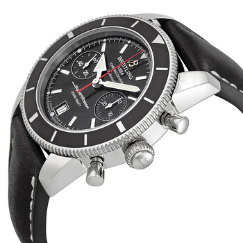 Stainless steel case with a black leather strap. Uni-directional rotating stainless steel bezel with black top ring. Black dial with luminous hands and index hour markers. Tachymeter scale appears around the outer rim. Dial Type: Analog. Luminescent hands and markers. Date display at the 6 o'clock position. Chronograph - two sub-dials displaying: 60 second and 30 minute. Automatic movement. Breitling 23 engine. Scratch resistant sapphire crystal. Screw locked crown. Solid case back. Case diameter: 44 mm. Case thickness: 16.2 mm. Round case shape. Band width: 20 m / 22 mm. Tang clasp. Water resistant at 200 meters / 660 feet. Functions: chronograph, date, hour, minute, second. Luxury watch style. Watch label: Swiss Made. Breitling Superocean Heritage Black Dial Black Leather Men's Watch A2337024-BB81BKLT.