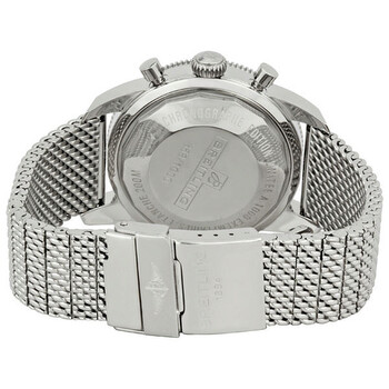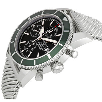 Silver-tone stainless steel case with a silver-tone stainless steel mesh bracelet. Uni-directional rotating coin edge stainless steel bezel with a green count-up elapsed time top ring. Black dial with silver-tone arrow-shaped hands and index hour markers. Minute markers around the outer rim. Dial Type: Analog. Luminescent hands and markers. Date display at the 3 o'clock position. Chronograph - three sub-dials displaying: 60 second, 30 minute and 12 hour. Breitling Calibre 13 Automatic movement, based upon ETA Valjoux 7750, containing 25 Jewels, bitting at 28800 vph, and has a power reserve of approximately 42 hours. Scratch resistant sapphire crystal. Screw down crown. Solid case back. Round case shape, case size: 46 mm. Band width: 24 mm. Deployment clasp. Water resistant at 200 meters / 660 feet. Functions: chronograph, chronometer, date, hour, minute, second. Superocean Heritage Chrono Series. Sport watch style. Watch label: Swiss made. Breitling Superocean Heritage Black Dial Men's Chronograph Watch A13320Q4-B908.