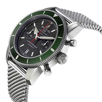 Stainless steel case with a stainless steel bracelet. Uni-directional rotating stainless steel bezel with a green ion-plated top ring. Black dial with silver-tone hands and stick hour markers. Minute markers around the outer rim. Dial Type: Analog. Luminescent hands and markers. Date display appears at the 6 o'clock position. Chronograph - two sub-dials displaying: 60 second and 30 minute. Automatic movement with a 42-hour power reserve. Scratch resistant sapphire crystal. Screw locked crown. Solid case back. Case diameter: 44 mm. Case thickness: 16.2 mm. Round case shape. Band width: 22 mm. Fold over clasp with safety release. Water resistant at 200 meters / 660 feet. Functions: chronograph, date, hour, minute, second. Luxury watch style. Watch label: Swiss Made. Breitling Superocean Heritage Chronograph 44 Black Dial Men's Watch A2337036-BB81.