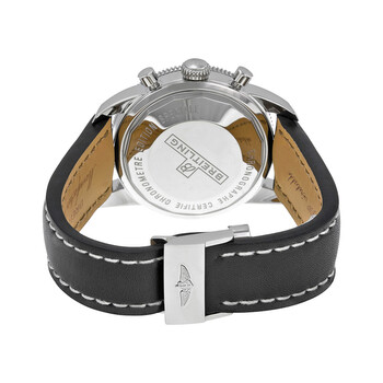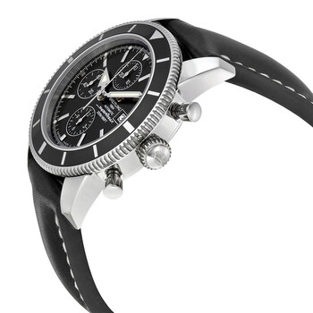 Stainless steel case with a black leather strap. Uni-directional rotating stainless steel bezel with a black top ring. Black dial with luminous silver-tone hands and index hour markers. Minute markers around the outer rim. Dial Type: Analog. Luminescent hands and markers. Date display at the 3 o'clock position. Chronograph - three sub-dials displaying: 60 second, 30 minute and 12 hour. Automatic movement with a 42 hour power reserve. Scratch resistant sapphire crystal. Screw locked crown. Solid case back. Case diameter: 46 mm. Case thickness: 16.4 mm. Round case shape. Band width: 24 mm / 20 mm. Fold over clasp. Water resistant at 200 meters / 660 feet. Functions: chronograph, date, hour, minute, second. Luxury watch style. Watch label: Swiss Made. Breitling Superocean Heritage Chronograph Black Dial Black Leather Men's Watch A1332024-B908BKLD.
