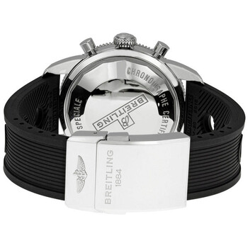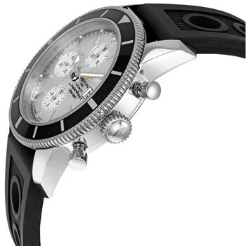 Stainless steel case with a black (ocean racer) rubber strap. Uni-directional rotating stainless steel bezel with a black top ring. Silver dial with luminous silver-tone hands and index hour markers. Minute markers around the outer rim. Dial Type: Analog. Luminescent hands and markers. Date display at the 3 o'clock position. Chronograph - three sub-dials displaying: 60 second, 30 minute and 12 hour. Breitling calibre 13 automatic movement with a 42-hour power reserve. Scratch resistant sapphire crystal. Screw locked crown. Screw in case back. Case size: 46 mm. Case thickness: 16.40 mm. Round case shape. Band width: 24 mm. Band length: 8.5 inches. Deployment clasp. Water resistant at 200 meters / 660 feet. Functions: chronograph, chronometer, date, hour, minute, second. Sport watch style. Watch label: Swiss Made. Item Variations: A1332024 G698, A1332024.G698, A1332024G698. Breitling SuperOcean Heritage Chronograph Men's Watch A1332024-G698.