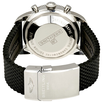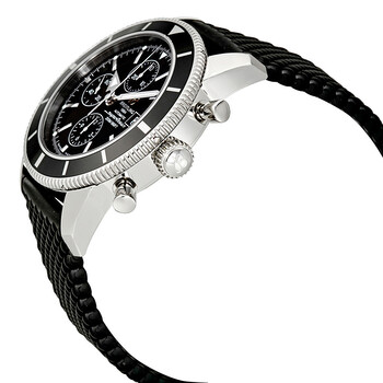 Stainless steel case with a black ( aero classic) rubber strap. Uni-directional rotating stainless steel bezel with a black top ring. Black dial with luminous fill silver-tone hands and index hour markers. Minute markers around the outer rim. Dial Type: Analog. Luminescent hands and markers. Date display at the 3 o'clock position. Chronograph - three sub-dials displaying: 60 second, 30 minute and 12 hour. Breitling calibre 13 automatic movement with a 42-hour power reserve. Scratch resistant sapphire crystal. Screw down crown. Solid case back. Case size: 46 mm. Case thickness: 13.60 mm. Round case shape. Band width: 24 mm / 20 mm. Tang clasp. Water resistant at 200 meters / 660 feet. Functions: chronograph, date, hour, minute, second. Luxury watch style. Watch label: Swiss Made. Breitling Superocean Heritage Chronographe 46 Men's Watch A1332024-B908-256S.