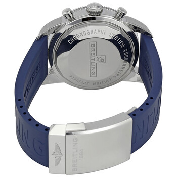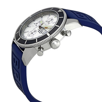 Silver-tone stainless steel case with a blue rubber (diver pro III strap. Uni-directional rotating stainless steel bezel with a black top ring. Silver dial with luminous silver-tone hands and index hour markers. Minute markers around the outer rim. Dial Type: Analog. Luminescent hands and markers. Date display at the 3 o'clock position. Chronograph - three sub-dials displaying: 60 second, 30 minute and 12 hours. Breitling calibre 13 automatic movement with a 40-hour power reserve. Scratch resistant sapphire crystal. Screw down crown. Solid case back. Case size: 46 mm. Case thickness: 16.70 mm. Round case shape. Band width: 24 mm. Deployment clasp. Water resistant at 200 meters / 660 feet. Functions: chronograph, date, hour, minute, second, chronometer. Dive watch style. Watch label: Swiss Made.Breitling Superocean Heritage Diver Pro III Automatic Chronograph Men's Watch A1332024/G698-160S-A20D.4