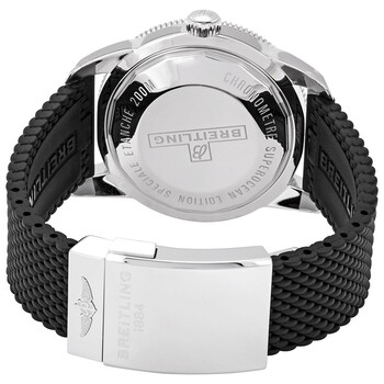 Stainless steel case with a black rubber (Aero Classic) strap. Uni-directional rotating stainless steel bezel with a black ceramic top ring. Black dial with luminous silver-tone hands and index hour markers. Minute markers around the outer rim. Dial Type: Analog. Luminescent hands and markers. Date display at the o'clock position. Breitling calibre 20 automatic movement with a 70-hour power reserve. Scratch resistant sapphire crystal. Screw down crown. Solid case back. Round case shape. Case size: 46 mm. Case thickness: 15 mm. Band width: 24 mm. Fold over clasp with a push button release. Water resistant at 200 meters / 660 feet. Functions: hour, minute, second. Luxury watch style. Watch label: Swiss Made. Item Variations: AB202012-BF74-256S-A20D.4. Breitling Superocean Heritage II Automatic Black Dial Men's Watch AB2020121B1S1.