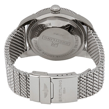 Stainless steel case with a stainless steel mesh bracelet. Uni-directional rotating coin edge stainless steel bezel with a blue ceramic (count-up elapsed time) top ring. Blue dial with luminous silver-tone arrow-shaped hands and index hour markers. Minute markers around the outer rim. Dial Type: Analog. Luminescent hands and markers. Date display at the o'clock position. Breitling calibre 20 automatic movement, based upon Tudor MT5612, containing 28 Jewels, bitting at 28800 vph, and has a power reserve of approximately 70 hours. Scratch resistant sapphire crystal. Screw locked crown. Solid case back. Round case shape. Case size: 46 mm. Case thickness: 15 mm. Band width: 24 mm. Fold over clasp with a safety release. Water resistant at 200 meters / 660 feet. Functions: date, hour, minute, second. Superocean Heritage II Series. Luxury watch style. Watch label: Swiss Made. Item Variations: AB202016-C961-152A. Breitling Superocean Heritage II Automatic 46 mm Blue Dial Men's Watch AB2020161C1A1.
