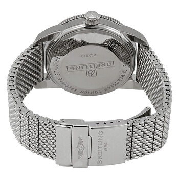 Stainless steel case with a stainless steel mesh bracelet. Uni-directional rotating stainless steel bezel with a black ceramic top ring. Black dial with luminous silver-tone hands and index hour markers. Minute markers around the outer rim. Dial Type: Analog. Luminescent hands and markers. Date display at the 6 o'clock position. Breitling calibre 20 automatic movement with a 70-hour power reserve. Scratch resistant sapphire crystal. Screw down crown. Solid case back. Round case shape. Case size: 42 mm. Case thickness: 14.35 mm. Band width: 22 mm. Fold over slip through clasp. Water resistant at 200 meters / 660 feet. Functions: date, hour, minute, second, chronometer. Luxury watch style. Watch label: Swiss Made. Item Variations: AB201012-BF73-154A. Breitling Superocean Heritage II Automatic Chronometer Black Dial Men's Watch AB2010121B1A1.