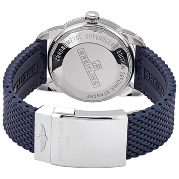 Stainless steel case with a blue rubber (Aero Classic) strap. Uni-directional rotating stainless steel bezel with a blue ceramic top ring. Blue dial with luminous silver-tone hands and index hour markers. Minute markers around the outer rim. Dial Type: Analog. Luminescent hands and markers. Date display at the 6 o'clock position. Breitling calibre 20 automatic movement with a 70-hour power reserve. Scratch resistant sapphire crystal. Screw down crown. Solid case back. Round case shape. Case size: 42 mm. Case thickness: 14.35 mm. Band width: 22 mm. Fold over clasp with a push button release. Water resistant at 200 meters / 660 feet. Functions: date, hour, minute, second, chronometer. Luxury watch style. Watch label: Swiss Made. Item Variations: AB201016-C960-281S-A20D.4. Breitling Superocean Heritage II Automatic Chronometer Blue Dial Men's Watch AB2010161C1S1.