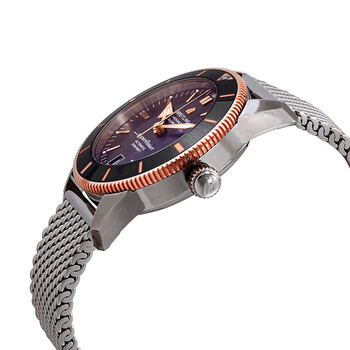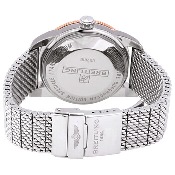 Stainless steel case with a stainless steel mesh bracelet. Uni-directional rotating 18kt rose gold bezel with black ceramic ring. Black dial with luminous rose gold hands and index hour markers. Minute markers around the outer rim. Dial Type: Analog. Luminescent hands and markers. Date display at the 6 o'clock position. Breitling calibre 20 automatic movement with a 70-hour power reserve. Scratch resistant sapphire crystal. Screw down crown. Solid case back. Round case shape. Case size: 42 mm. Case thickness: 14.35 mm. Band width: 22 mm. Fold over clasp with a safety release. Water resistant at 200 meters / 660 feet. Functions: date, hour, minute, second, chronometer. Luxury watch style. Watch label: Swiss Made. Item Variations: UB201012-BG53-154A. Breitling Superocean Heritage II Automatic Chronometer Black Dial 42 mm Men's Watch UB2010121B1A1.