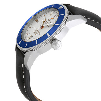 Silver-tone stainless steel case with a black leather strap. Uni-directional rotating blue ceramic bezel. Silver dial with silver-tone hands and index hour markers. Minute markers around the outer rim. Dial Type: Analog. Luminescent hands. Date display at the 6 o'clock position. Breitling Calibre B20 automatic movement with a 70-hour power reserve. Scratch resistant sapphire crystal. Screw down crown. Case size: 46 mm. Case thickness: 15 mm. Round case shape. Band width: 24 mm. Band length: 7 inches. Tang clasp. Water resistant at 200 meters / 660 feet. Functions: date, hour, minute, second, chronometer. Sport watch style. Watch label: Swiss Made. Breitling Superocean Heritage II Automatic Men's Leather Watch AB202016/G828-441X.