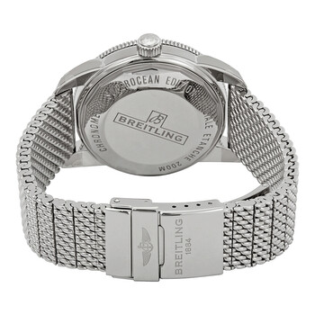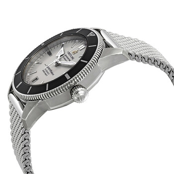 Stainless steel case with a stainless steel mesh bracelet. Uni-directional rotating stainless steel bezel with a black ceramic top ring. Stratus silver dial with silver-tone hands and index hour markers. Minute markers around the outer rim. Dial Type: Analog. Luminescent hands and markers. Date display at the 6 o'clock position. Breitling calibre 20 automatic movement with a 70-hour power reserve. Scratch resistant sapphire crystal. Screw down crown. Solid case back. Round case shape. Case size: 42 mm. Case thickness: 14.35 mm. Band width: 22 mm. Fold over clasp with a push button release. Water resistant at 200 meters / 660 feet. Functions: date, hour, minute, second, chronometer. Luxury watch style. Watch label: Swiss Made. Breitling Superocean Heritage II Automatic Men's Watch AB201012/G827-154A.