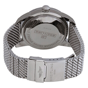 Stainless steel case with a stainless steel mesh bracelet. Uni-directional rotating stainless steel bezel with a blue ceramic ring. Silver dial with luminous silver-tone arrow-shaped hands and index hour markers. Minute markers around the outer rim. Dial Type: Analog. Luminescent hands and markers. Date display at the 6 o'clock position. Breitling calibre B20 automatic movement, based upon Tudor MT5612, containing 28 Jewels, bitting at 28800 vph, and has a power reserve of approximately 70 hours. Scratch resistant sapphire crystal. Screw locked crown. Solid case back. Round case shape. Case size: 46 mm. Case thickness: 15 mm. Band width: 24 mm. Fold over slip through clasp. Water resistant at 200 meters / 660 feet. Functions: date, hour, minute, second. Sport watch style. Watch label: Swiss Made. Breitling Superocean Heritage II Automatic Men's Watch AB202016/G828-152A.