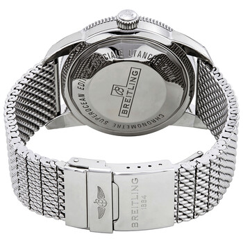 Stainless steel case with a stainless steel mesh bracelet. Uni-directional rotating stainless steel bezel with a blue ceramic top ring. Blue dial with luminous silver-tone hands and index hour markers. Minute markers around the outer rim. Dial Type: Analog. Luminescent hands and markers. Date display at the 6 o'clock position. Breitling calibre B20 automatic movement with a 70-hour power reserve. Scratch resistant sapphire crystal. Screw down crown. Solid case back. Round case shape. Case size: 46 mm. Case thickness: 15 mm. Band width: 24 mm. Deployment clasp. Water resistant at 200 meters / 660 feet. Functions: date, hour, minute, second. Casual watch style. Watch label: Swiss Made. Breitling Superocean Heritage II Blue Dial Men's Watch AB202016/C961-152A.