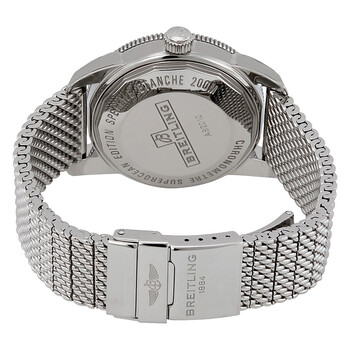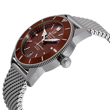 Stainless steel case with a stainless steel mesh bracelet. Uni-directional rotating stainless steel bezel with a bronze ceramic top ring. Bronze dial with luminous silver-tone hands and index hour markers. Minute markers around the outer rim. Dial Type: Analog. Luminescent hands and markers. Date display at the 6 o'clock position. Breitling calibre B20 automatic movement with a 70-hour power reserve. Scratch resistant sapphire crystal. Screw down crown. Solid case back. Round case shape. Case size: 42 mm. Case thickness: 14.35 mm. Band width: 22 mm. Band length: 7 inches. Fold over clasp with a push button release. Water resistant at 200 meters / 660 feet. Functions: date, hour, minute, second. Casual watch style. Watch label: Swiss Made. Breitling Superocean Heritage II Bronze Dial Men's Watch AB201033/Q617-154A.