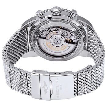 Stainless steel case with a stainless steel mesh bracelet. Uni-directional rotating stainless steel bezel with a black ceramic ring. Silver dial with luminous silver-tone arrow-shaped hands and index hour markers. Minute markers around the outer rim. Dial Type: Analog. Luminescent hands and markers. Date display between the 4 and 5 o'clock positions. Chronograph - three black sub-dials displaying: 60 second, 30 minute and 12 hour. Breitling calibre 01 automatic movement with a 70-hour power reserve. Scratch resistant sapphire crystal. Screw locked crown. Transparent case back. Round case shape. Case size: 44 mm. Case thickness: 15.50 mm. Band width: 22 mm. Fold over clasp with a safety release. Water resistant at 200 meters / 660 feet. Functions: chronograph, date, hour, minute, second, chronometer. Luxury watch style. Watch label: Swiss Made. Item Variations: AB016212-G840-154A. Breitling Superocean Heritage II Chronograph Automatic Chronometer Silver Dial Men's Watch AB0162121G1A1.
