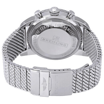 Stainless steel case with a stainless steel mesh bracelet. Uni-directional rotating stainless steel bezel with a black ceramic ring. Black dial with luminous silver-tone arrow-shaped hands and index hour markers. Minute markers around the outer rim. Dial Type: Analog. Luminescent hands and markers. Day of the week and date display at the 3 o'clock position. Chronograph - three sub-dials displaying: 60 second, 30 minute and 12 hours. Breitling calibre 13 automatic movement, based upon ETA Valjoux 7750, containing 25 Jewels, bitting at 28800 vph, and has a power reserve of approximately 42 hours. Scratch resistant sapphire crystal. Screw locked crown. Solid case back. Round case shape. Case size: 44 mm. Case thickness: 15.65 mm. Band width: 22 mm / 20 mm. Fold over clasp with a safety release. Water resistant at 200 meters / 660 feet. Functions: chronograph, date, hour, minute, second. Luxury watch style. Watch label: Swiss Made. Item Variations: A1331312-BG49-154A. Breitling Superocean Heritage II Chronograph Automatic Black Dial Men's Watch A13313121B1A1.