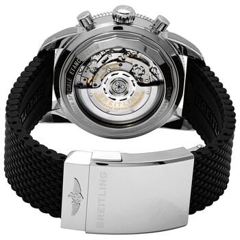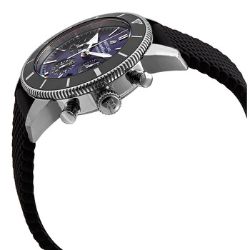 Stainless steel case with a black rubber (aero classic) strap. Uni-directional rotating stainless steel bezel with a black ceramic top ring. Blue dial with luminous silver-tone arrow-shaped hands and index hour markers. Minute markers around the outer rim. Dial Type: Analog. Luminescent hands and markers. Date display between the 4 and 5 o'clock positions. Chronograph - three sub-dials displaying: 60 second, 30 minute and 12 hours. Breitling calibre 01 automatic movement, containing 47 Jewels, composed of 346 parts, bitting at 28800 vph, and has a power reserve of approximately 70 hours. Scratch resistant sapphire crystal. Screw locked crown. Solid case back. Round case shape. Case size: 44 mm. Case thickness: 15.50 mm. Band width: 22 mm / 20 mm. Fold over clasp with a safety release. Water resistant at 200 meters / 660 feet. Functions: chronograph, column wheel, date, hour, minute, second, chronometer. Luxury watch style. Watch label: Swiss Made. Breitling Superocean Heritage II Chronograph Automatic Blue Dial Men's Watch AB0162121C1S1.