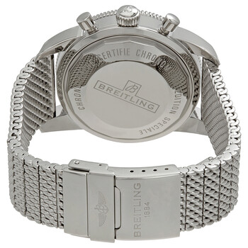 Stainless steel case with a stainless steel mesh bracelet. Uni-directional rotating stainless steel bezel with a blue ceramic top ring. Blue dial with luminous silver-tone hands and index hour markers. Minute markers around the outer rim. Dial Type: Analog. Luminescent hands and markers. Date display at the 3 o'clock position. Chronograph - three sub-dials displaying: 60 seconds, 30 minutes, and 12 hours. Breitling calibre 13 automatic movement with a 42-hour power reserve. Scratch resistant sapphire crystal. Screw down crown. Solid case back. Round case shape. Case size: 46 mm. Case thickness: 16.35 mm. Band width: 24 mm. Deployment clasp with a push button release. Water resistant at 200 meters / 660 feet. Functions: chronograph, date, hour, minute, second, chronometer. Luxury watch style. Watch label: Swiss Made. Breitling Superocean Heritage II Chronograph Automatic Chronometer Blue Dial Men's Watch A1331216/C963SS.