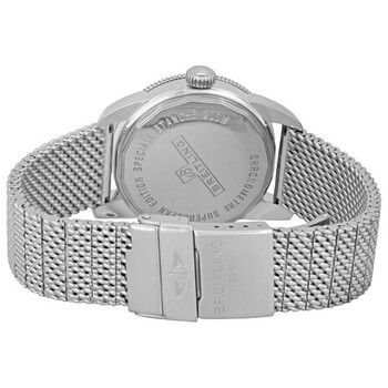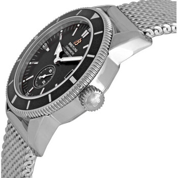 Steel case with a steel mesh bracelet. Unidirectional rotating bezel. Black dial with luminous hands and stick hour markers. Minute markers around the outer rim. Luminescent hands and markers. Date displays at the 3 o'clock position. Small seconds sub dials. Automatic movement. Scratch resistant sapphire crystal. Screw locked crown with two gaskets. Screwed in case back. Case diameter: 38 mm. Water resistant at 200 meters/ 660 feet. Functions: hours, minutes, small seconds, date. Breitling Superocean Heritage Men's Watch A3732024B8149A.