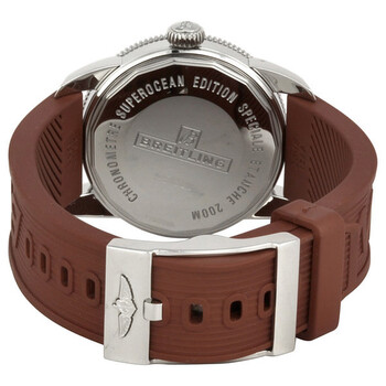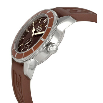 Stainless steel case with a brown rubber bracelet. Unidirectional ratcheting brown ion-plated bezel. Brown dial with luminous hands. Minute markers around the outer rim. Luminescent hands and dial markers. Date displays at the 3 o'clock position. Small seconds sub-dial at the 6 o'clock position. Self winding mechanical movement. Scratch resistant cambered glareproofed sapphire crystal. Screw locked crown. Screw in case back. Case diameter: 38 mm. Case thickness: 12.10 mm. Deployment clasp. Water resistant at 200 meters/ 660 feet. Functions: hours, minutes, small seconds, date. Breitling Superocean Heritage Watch A3732033-Q543BROR.