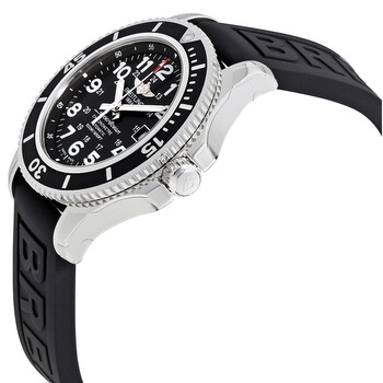 Stainless steel case with a black (diver pro III) rubber strap. Uni-directional rotating stainless steel bezel with a black top ring. Black dial with luminous silver-tone hands and Arabic numeral hour markers. 24 hour markers. Minute markers around the outer rim. Dial Type: Analog. Luminescent hands and markers. Date display at the 3 o'clock position. Breitling calibre 17 automatic movement with a 40-hour power reserve. Scratch resistant sapphire crystal. Screw locked crown. Solid case back. Case size: 42 mm. Case thickness: 13.30 mm. Round case shape. Band width: 20 mm / 18 mm. Deployment clasp. Water resistant at 500 meters / 1650 feet. Functions: date, hour, minute, second, 24 hour. Luxury watch style. Watch label: Swiss Made. Breitling Superocean II 42 Black Dial Men's Watch A17365C9/BD67BKPD3.