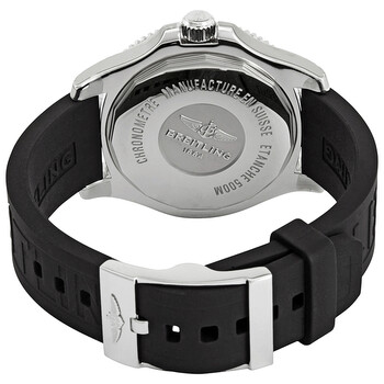 Stainless steel case with a black (Diver Pro III) rubber strap. Uni-directional rotating stainless steel bezel with a black rubber inlay. Black dial with luminous silver-tone hands and Arabic numeral hour markers. 24 hour markers. Minute markers around the outer rim. Dial Type: Analog. Luminescent hands and markers. Date display at the 3 o'clock position. Breitling Calibre 17 automatic movement. Scratch resistant sapphire crystal. Screw locked crown. Solid case back. Round case shape. Case size: 42 mm. Case thickness: 13.30 mm. Band width: 20 mm. Tang clasp. Water resistant at 500 meters / 1650 feet. Functions: date, hour, minute, second. Dive watch style. Watch label: Swiss Made. Breitling Superocean II Automatic Black Dial Men's Watch A17365C91B1S1.
