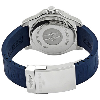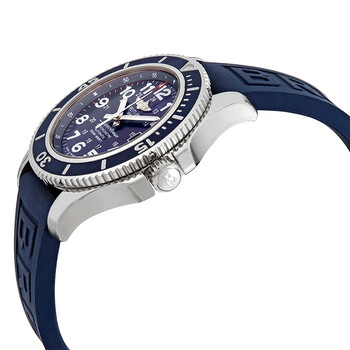 Silver-tone stainless steel case with a blue rubber strap. Uni-directional rotating silver-tone bezel. Blue dial with silver-tone hands and Arabic numeral hour markers. Dial Type: Analog. Luminescent hands. Date display at the 3 o'clock position. Breitling Calibre 17 automatic movement with a 40-hour power reserve. Scratch resistant sapphire crystal. Screw down crown. Solid case back. Round case shape, case size: 42 mm, case thickness: 13.30 mm. Band width: 20 mm. Deployment with push button release clasp. Water resistant at 500 meters / 1650 feet. Functions: date, hour, minute, second. Dive watch style. Watch label: Swiss Made. Breitling Superocean II Automatic Blue Dial Men's Watch A17365D11C1S2.
