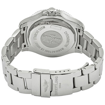 Stainless steel case with a stainless steel bracelet. Uni-directional rotating stainless steel bezel with a blue rubber inlay. Mariner blue dial with luminous silver-tone hands and Arabic numeral hour markers. 24 hour markers. Minute markers around the outer rim. Dial Type: Analog. Luminescent hands. Date display at the 3 o'clock position. Breitling calibre 17 automatic movement with a 38-hour power reserve. Scratch resistant sapphire crystal. Screw locked crown. Solid case back. Round case shape. Case size: 42 mm. Case thickness: 13.30 mm. Band width: 20 mm. Fold over clasp with a push button release. Water resistant at 500 meters / 1650 feet. Functions: date, hour, minute, second. Dive watch style. Watch label: Swiss Made. Breitling Superocean II Automatic Mariner Blue Dial Men's Watch A17365D11C1A1.