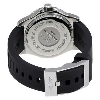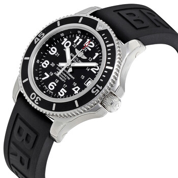 Stainless steel case with a black (diver pro III) rubber strap. Uni-directional rotating stainless steel bezel with a black top ring. Black dial with luminous silver-tone hands and Arabic numeral hour markers. 24 hour markers. Minute markers around the outer rim. Dial Type: Analog. Luminescent hands and markers. Date display at the 3 o'clock position. Breitling calibre 17 automatic movement with a 40-hour power reserve. Scratch resistant sapphire crystal. Screw locked crown. Solid case back. Case size: 36 mm. Case thickness: 11.25 mm. Round case shape. Band width: 18 mm / 16 mm. Tang clasp. Water resistant at 200 meters / 660 feet. Functions: hour, minute, second. Luxury watch style. Watch label: Swiss Made. Breitling Superocean II Automatic Black Dial Midsize Watch A17312C9-BD91BKPT3.