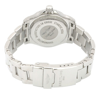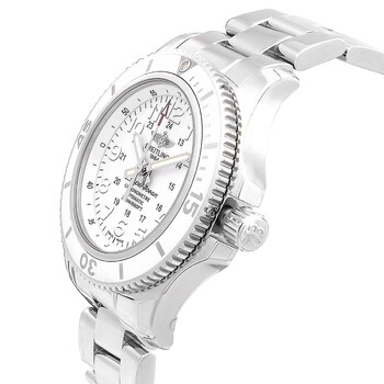 Stainless steel case with a stainless steel bracelet. Uni-directional rotating bezel. White dial with silver-tone hands and Arabic numeral hour markers. Minute markers around the outer rim. Dial Type: Analog. Luminescent hands and markers. Date display at the 3 o'clock position. Breitling Calibre 17 automatic movement with about 40 hours of power reserve. Scratch resistant mineral crystal. Screw down crown. Solid case back. Case size: 36 mm. Round case shape. Band width: 18 mm. Water resistant at 200 meters / 660 feet. Functions: date, hour, minute, second. Luxury watch style. Watch label: Swiss Made. Breitling Superocean II White Dial Automatic Unisex Watch A17312D2/A775-179A.
