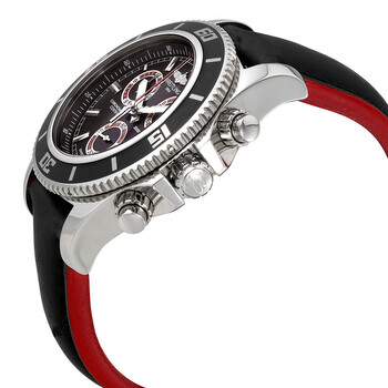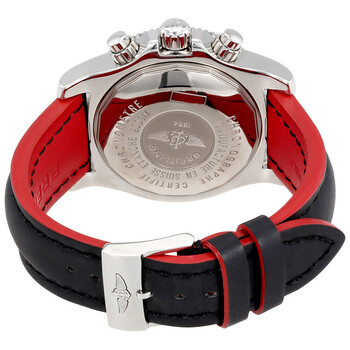 Stainless steel case with a black and red (Superocean) leather strap. Uni-directional rotating stainless steel bezel with a black top ring. Black dial with luminous silver-tone hands and index hour markers. Minute markers. 1/100th markers around the outer rim. Dial Type: Analog. Luminescent hands and markers. Date display between the 4 and 5 o'clock positions. Chronograph - three sub-dials displaying: 60 second, 12 hour and 1/10th of a second. Breitling calibre 73 quartz movement. Scratch resistant sapphire crystal. Screw locked crown. Solid case back. Round case shape. Case size: 46 mm. Case thickness: 19.10 mm. Band width: 24 mm / 20 mm. Tang clasp. Water resistant at 2000 meters / 6600 feet. Functions: chronograph, date, hour, minute, second, chronometer. Dive watch style. Watch label: Swiss Made. Breitling Superocean M2000 Chronograph Men's Watch A73310A8-BB72BKRDT.