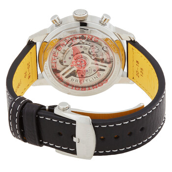 Silver-tone stainless steel case with a black calfskin leather strap. Fixed silver-tone stainless steel bezel. Ice blue dial with silver-tone hands and index hour markers. Minute markers around the outer rim. Dial Type: Analog. Luminescent hands and markers. Chronograph - two sub-dials displaying: 60 second and 30 minute. Breitling Calibre 01 (TECH-205) automatic movement with a 70-hour power reserve. Scratch resistant sapphire crystal. Pull / push crown. Transparent case back. Round case shape, case size: 41 mm, case thickness: 13.3 mm. Band width: 20 mm. Folding clasp. Water resistant at 100 meters / 330 feet. Functions: chronograph, hour, minute, second, chronometre. Top Time B01 Triumph Series. Sport watch style. Watch label: Swiss Made. Breitling Top Time B01 Triumph Chronograph Automatic Ice Blue Dial Men's Watch AB01764A1C1X1.
