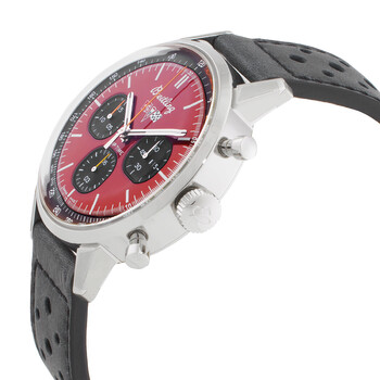 Silver-tone stainless steel case with a black leather strap. Fixed tachymeter scale silver-tone stainless steel bezel. Red dial with silver-tone hands and index hour markers. Minute markers around the outer rim. Dial Type: Analog. Luminescent hands and markers. Chronograph - three sub-dials displaying: 60 second, 15 minute and 6 hour. Breitling Calibre 25 Automatic movement, based upon ETA 2892-A2, containing 21 Jewels, bitting at 28800 vph, and has a power reserve of approximately 42 hours. Scratch resistant sapphire crystal. Pull / push crown. Round case shape, case size: 42 mm. Deployment with push button release clasp. Water resistant at 100 meters / 330 feet. Functions: chronograph, hour, minute, small second. Additional Info: original box, international warranty card, manual (complete accessories). Top Time Chevrolet Corvette Series. Luxury watch style. Watch label: Swiss Made. Breitling Top Time Chevrolet Corvette Chronograph Automatic Red Dial Men's Watch A25310241K1X1.